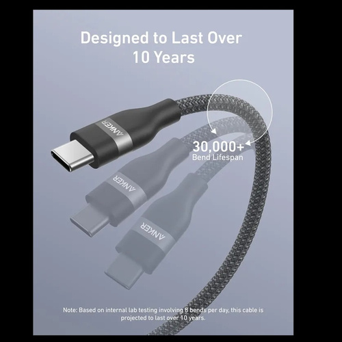 - دوام و مقاومت بالا: روکش بافته شده این کابل از مواد بازیافتی ساخته شده که علاوه بر مقاومت در برابر سایش و پارگی، به حفظ محیط زیست نیز کمک میکند. انکر مدعی است که این کابل میتواند بیش از 30000 بار خم شدن را تحمل کند، که نشان از طول عمر بالای آن دارد.