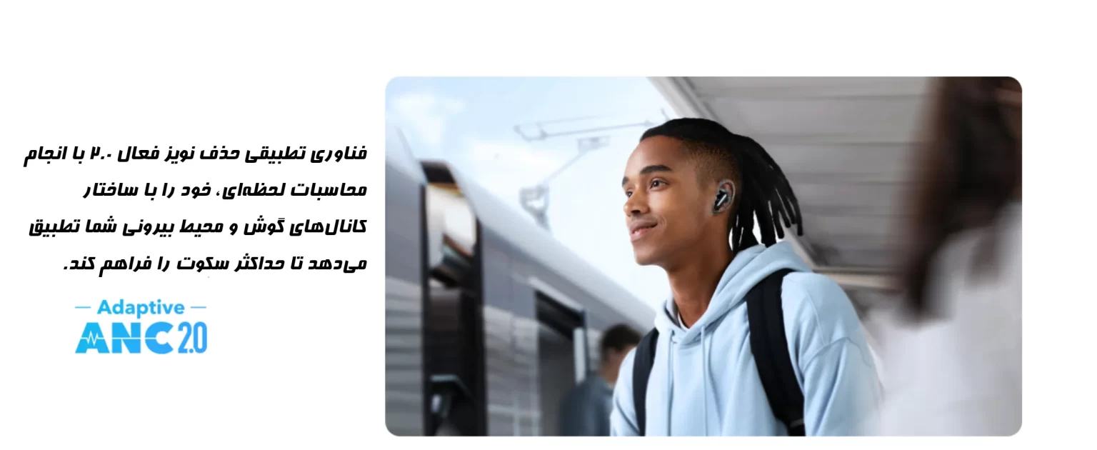 Liberty 4 NC با فناوری Adaptive Noise Cancelling 2.0 میتواند تا 98.5٪ نویز محیطی را حذف کند. این سیستم با استفاده از 6 میکروفون و الگوریتم هوشمند، محیط اطراف را آنالیز کرده و بهصورت زنده میزان حذف نویز را تنظیم میکند. از حالتهای مختلف ANC برای موقعیتهای مختلف مانند سفر، مترو یا محیطهای کاری بهرهمند شوید.