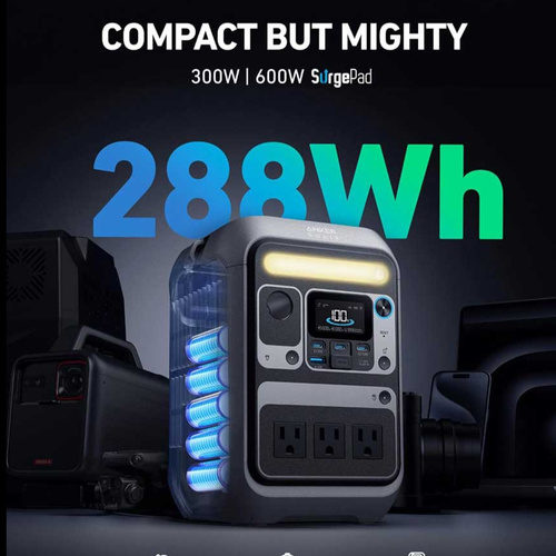 پاور استیشن مدل SOLIX C300 انکر، ظرفیت 288 وات ساعت (Wh) و توان 600 وات دارد. در نتیجه انرژی مورد نیاز برای شارژ دستگاه های مختلف را در هر مکان و زمان تأمین می کند. این دستگاه توان خروجی پیوسته 300 وات دارد و در لحظات کوتاه تا 600 وات توان لحظه ای (Surge Power) ارائه می دهد. به همین دلیل این دستگاه برای تأمین برق مورد نیاز وسایل کوچک خانگی، ابزار الکترونیکی و تجهیزات سفر استفاده می شود.