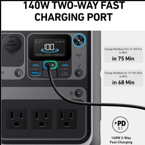 خروجی USB-C یک درگاه دو طرفه (Input/Output) با توان 140 وات است. این درگاه برای شارژ سریع لپ تاپ های مک بوک یا تبلت استفاده می شود. همچنین برای شارژ موبایل و پاوربانک ها نیز کارآمد است. پورت های USB-A این دستگاه برای شارژ هم زمان چند وسیله طراحی شده اند. این درگاه ها برای شارژ دستگاه های کوچک مانند ساعت های هوشمند یا اسپیکرهای قابل حمل مناسب هستند.