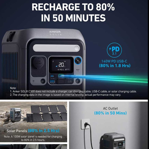 پاور استیشن انکر مدل SOLIX C300 با توان 600 وات قابلیت شارژ فوق سریع (UltraFast Charging) دارد. با استفاده از ورودی AC حدود 50 دقیقه زمان لازم است تا 80 درصد این دستگاه شارژ شود. پاور استیشن SOLIX C300 برای شارژ کامل به 1.5 ساعت زمان نیاز دارد. این سرعت شارژ به دلیل بهره مندی دستگاه از فناوری اختصاصی HyperFlash™ است.