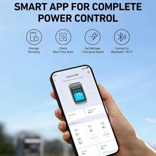 پاور استیشن انکر مدل SOLIX C300 با توان 600 وات به اپلیکیشن رسمی Anker App متصل می شود. این دستگاه از طریق بلوتوث یا وای فای وضعیت باتری یا میزان مصرف انرژی را نمایش می دهد. دمای داخلی دستگاه یا زمان باقیمانده شارژ و نوع پورت های فعال نیز از دیگر مواردی به شمار می روند که با استفاده از اپلیکیشن قابل مشاهده هستند. این دستگاه حالت Eco Mode دارد که بعد از اتمام شارژ دستگاه ها و پایان مصرف انرژی، پاور استیشن را به صورت خودکار خاموش می کند تا انرژی باتری هدر نرود.