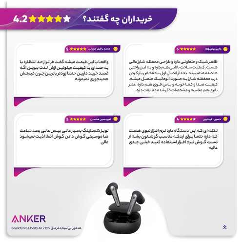 به صورت کلی هدفون بی سیم انکر مدل SoundCore Liberty Air 2 pro Anker به دلیل ساختار بسیار سبک، طراحی ارگونومیک و شارژدهی بالا همراه با سیستم حذف نویز پیشرفته، مناسب افرادی است که قصد استفاده طولانی مدت از آن به عنوان هدفون مکالمه را دارند باشد.