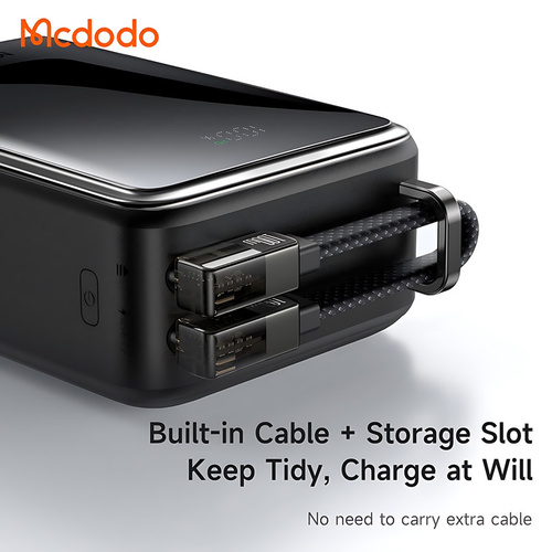 سوپر شارژر 100 وات مک دودو Mcdodo MC-056 Ultra Mini Power Bank 25000mAh به همراه یک کابل فست شارژ دو سر تایپسی 20سانتیمتری با روکش بافته شده و شدت جریان خروجی 5 آمپر عرضه میشود که میتوانید با آن پاوربانک را سریع شارژ کنید. همچنین، جایگاهی از جنس آلیاژ روی بر روی بدنه پاوربانک تعبیه شده که میتوانید کابل را در آن قرار دهید تا از درهم ریختگی و به هم ریختگی آن جلوگیری کنید.